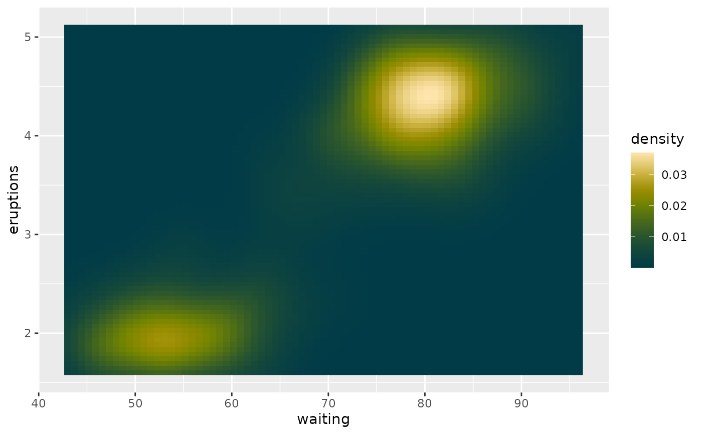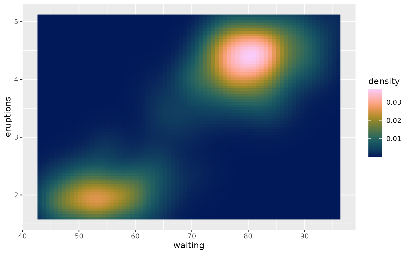 ggplot2::ggplot(faithfuld, ggplot2::aes(waiting, eruptions, fill = density)) +
